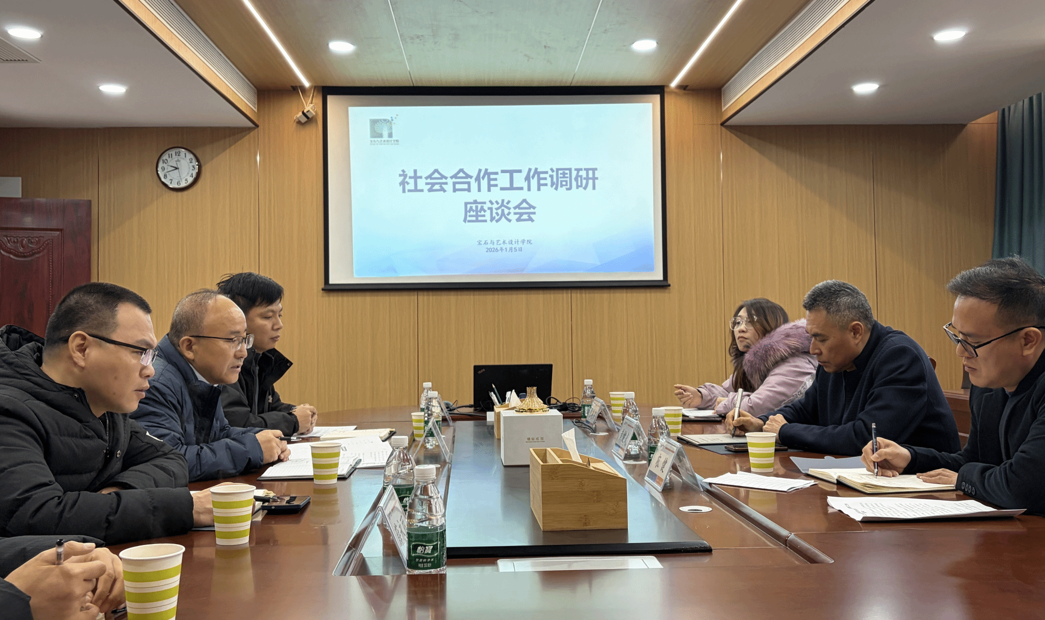 2026年1月5日上午,学校社会合作工作处到宝石与艺术设计学院开展调研,学校党委常委、统战部部长黄健武,社会合作处副处长农健,学院领导参加座谈。贠禄院长就学院办学特色与优势,与企业前期开展社会合作情况进行了详细介绍。吴海彪副院长聚焦产业学院建设,结合本地市场环境,分析产业需求与学院人才培养、科研创新营造契合点。薛永丽副院长介绍正在建设的宝石鉴定中心的项目进度,加强校企合作,打造实践教学与科研平台,强化学生实践技能、...