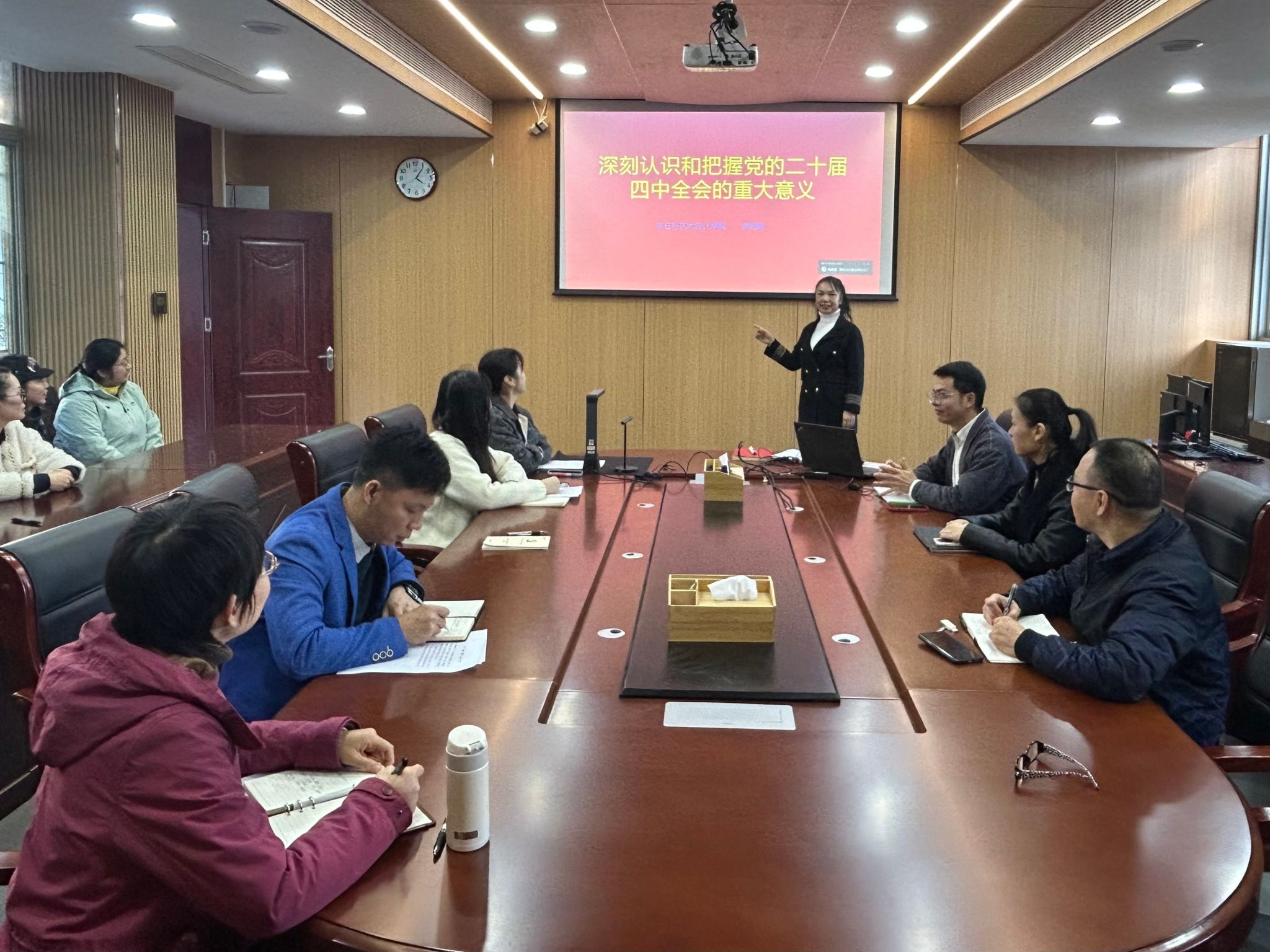 11月21日下午,宝石与艺术设计学院党委在实验楼会议室开展学习贯彻党的二十届四中全会精神专题学习,学院党委书记钟海明做专题报告,全体教师党员参加学习。钟海明从深刻认识和把握党的二十届四中全会的重大意义出发,讲述党的二十届四中全会的历史意义、现实意义、理论意义和指导意义。强调广大党员要以学习转化为实际行为,扎实做好本科教育教学审核评估的各项工作。辅导员代表熊水霞做交流发言,要结合学生思想政治工作,破解热点难点问题,...