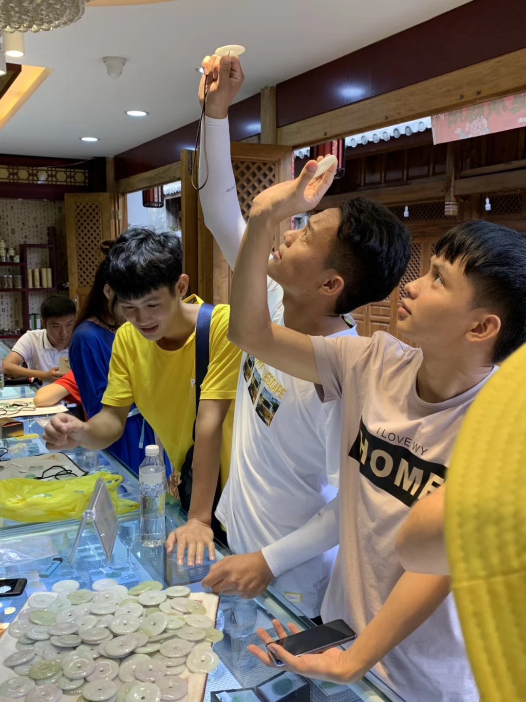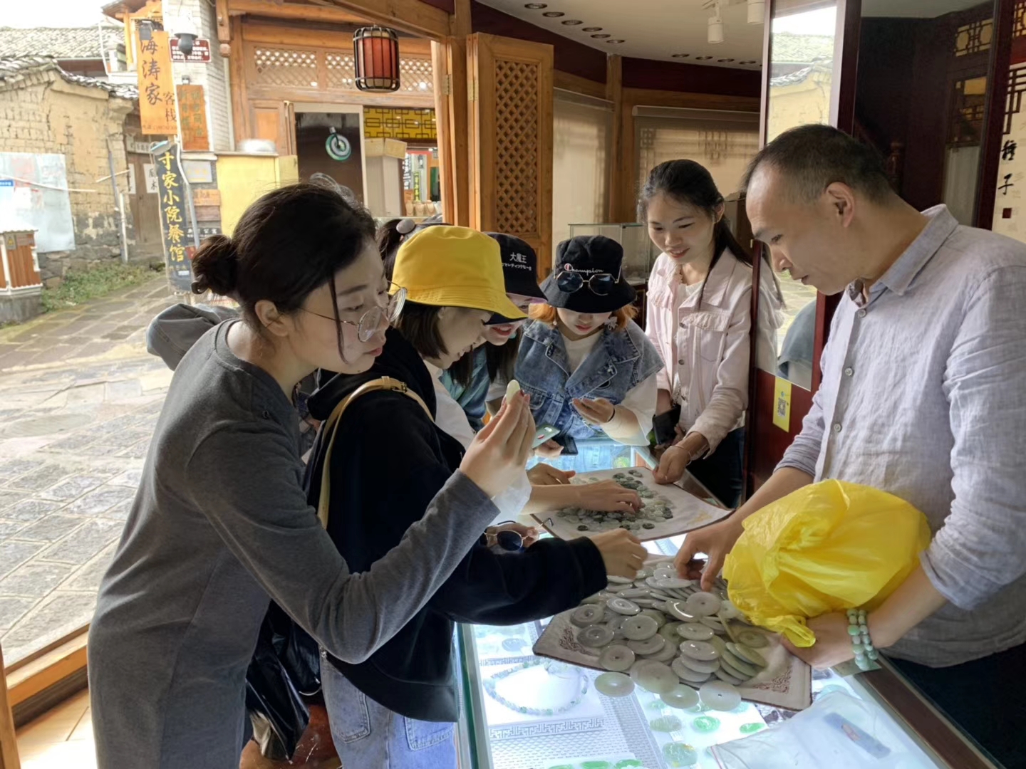 云南珠宝考察学生认真观察翡翠饰品
