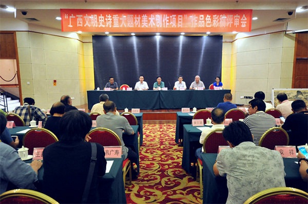 今年暑期,“广西文明史诗重大题材美术创作项目”作品色彩稿评审会在南宁市举行,自治区党委宣传部副部长宋震寰,广西文联党组书记、主席洪波,广西文联巡视员、副主席韦苏文,广西文联党组成员、副主席黄云龙、广西文联副巡视员、广西美协主席谢麟,自治区党委宣传部文艺处处长李滨夙等领导出席了会议,广西美协部分主席团成员、顾问,广西著名美术专家教授,以及50多位入围作品的作者参加了这次评审会。