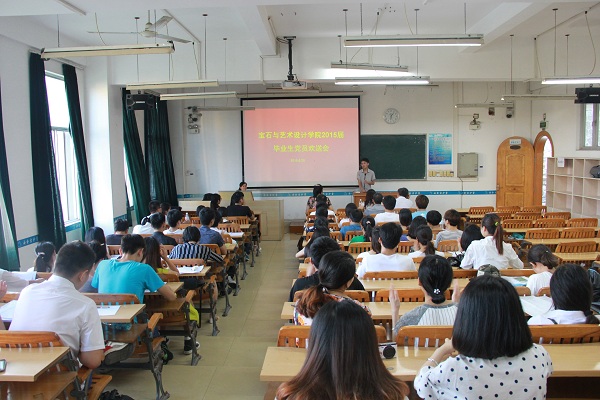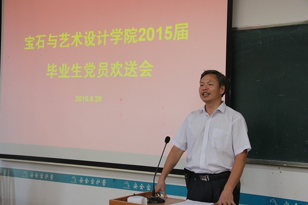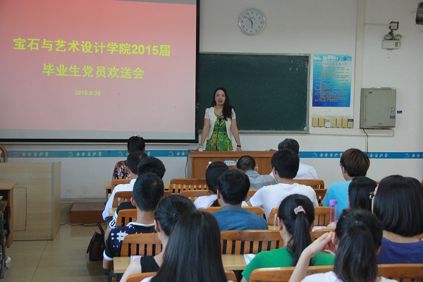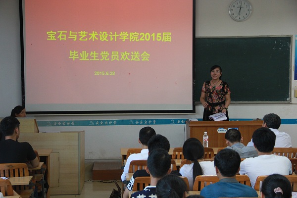 2015年6月28日17:20,在南楼201教室召开了宝石与艺术设计学院2015届毕业生党员欢送会。会议由学院党委副书记王珍主持,学院党委书记钟海明同志、学院副院长唐哲同志、学院党委组织委员韦云霞同志、全体毕业生党员、部分新入党非毕业生党员参加了会议。