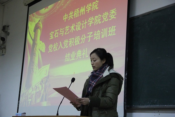 结业典礼由宝石与艺术设计学院党委组织委员、本期党校培训班班主任韦云霞老师主持,宝石与艺术设计学院党委书记、党校校长钟海明,宝石与艺术设计学院党委副书记、党校副校长王珍,宝石与艺术设计学院2012级辅导员黎永翔出席此次结业典礼。