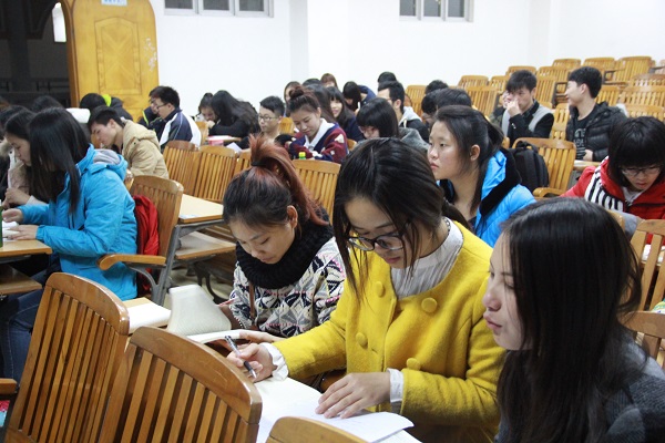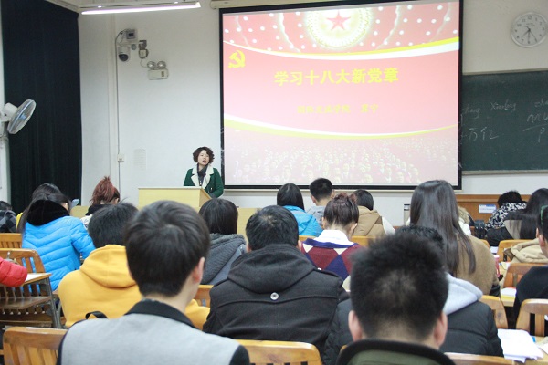 为深入学习,理解,贯彻好十八大精神,帮助广大入党积极分子正确的认识国情,坚持理想信念,同时加强校风 、学风建设,提高同学的党性意识和整体素质,2015年1月9日晚,在综合大楼S301举行“十八大党章解读”,由国际交流学院党委副书记冀宁老师为我们讲解。