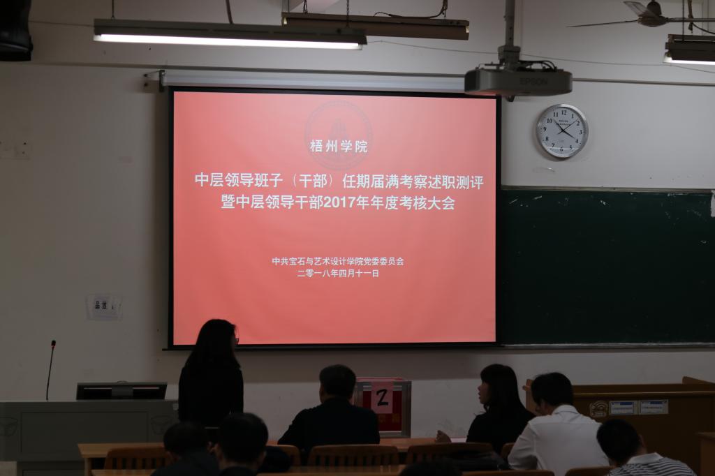 根据学校党委《2018年中层领导班子换届和中层领导干部调整聘任工作实施方案》和《关于做好中层领导干部任期届满考察和2017年年度考核工作的通知》要求,4月11日下午16:00,在明理理惑楼北楼202教室,宝石与艺术设计学院召开了中层干部届满考核民主测评会议。我院党委书记钟海明、副院长唐哲等院领导以及全体中层干部、相关系部的教职工参加了会议,会议由钟海明书记主持。