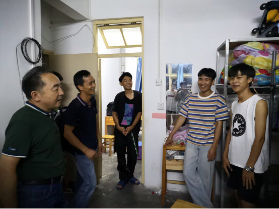 为了更加的了解新生的情况,我院的戴继明院长,党委副书记黄石莲老师,贠禄副院长,吴海彪副院长,团委书记张亚敏老师,以及19级的各班班主任、班导和院学生会干部,在9月14日迎新结束后,依次到我院各个新生所在的宿舍进行走访。