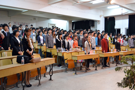 庄严的国歌声中,大会正式开始。出席大会的有我系党总支副书记甘阳,艺术系分团委书记张亚敏,同时,出席本次大会的还有学校学生会、各兄弟系学生干部、我系学生代表。大会在分团委书记张亚敏老师的致辞中拉开了帷幕。