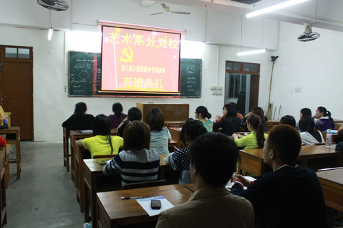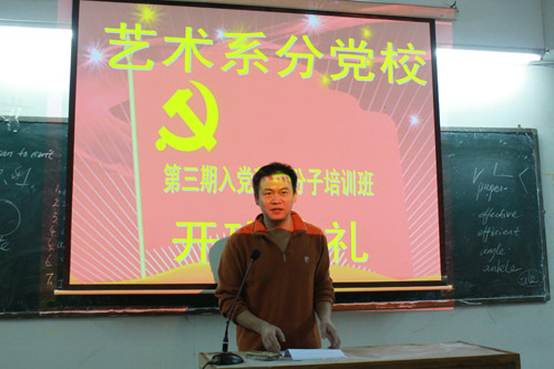 4月2日晚,艺术系西校区入党积极分子培训班开班仪式在西区食堂二楼举行。系党总支副书记甘阳对新进入党积极分子给予厚望,他对参加培训班的同学们:你们是团支部层层选拔出来的优秀学生,你们要在平时表现中发挥先锋模范作用,为其他同学树立榜样。同时参加党校培训班时要遵守党校纪律,遵守党校纪律是检验一个人入党的诚心与党性。 随后,由艺术系党支部学生党组织书记李青老师向参加入党培训的学员宣读学生入党培训班的课堂纪律与考勤制度。最后,在甘阳副书记的庄重宣布下,艺术系西校区新一届学生入党培训班正式开班。