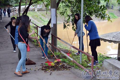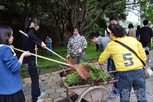 为积极响应学校“我为校园环保作贡献”的主题活动, 3月31日上午9:00,艺术系100多名学生及学生干部在李青老师的带领下在教职工宿舍区以及桃花岛道路区域进行校园清洁活动。