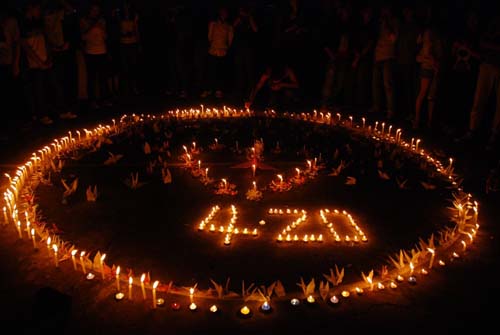 同学们用蜡烛与手折的纸花和纸鹤在操场中央摆出心形与4、20字样的花坛造型。活动由艺术系辅导员陈宇思与一名同学点燃花坛中间的长明灯而开始,随后与会同学们陆续上前在长明灯前点燃自己手持的蜡烛。每位同学都肃立在花坛周围手持蜡烛,为逝者默哀,为生者祈福。在全体默哀的同时,由自愿者点燃花坛中4、20字样的蜡烛,活动达到高潮。
