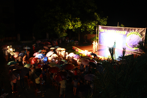 当天19点30分左右开始连续下雨,为了不让提前到场等候的众多观众失望,原计划晚上8时举行的晚会,最终在8时30分冒雨举行。演出中,我校师生和当地村民文艺爱好者带来的11个节目,类型包括舞蹈、独舞、歌曲演唱、朗诵、快板等精彩的节目,引来了一片掌声。晚会进行时,我系张亚敏老师心系学生,找后勤组的老师与同学为雨中台前台后工作的老师和同学们准备了红糖姜水。