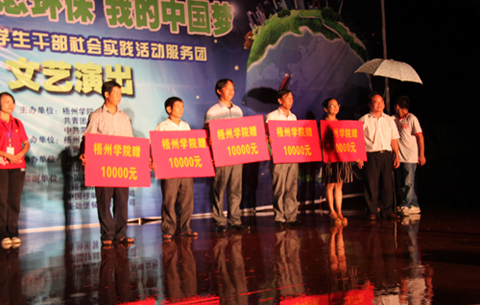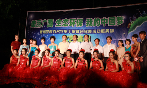 7月22日晚, 为深入贯彻党的十八大精神和习近平总书记五四重要讲话精神,在“美丽广西•清洁乡村”的主题下,艺术系20名志愿者在张亚敏老师、黄健铭老师的带领下到蒙山县进行大学生暑期“三下乡”社会实践活动。艺术系与艺术团组成的暑期三下乡“烛光团队”文艺服务队在蒙山县蒙山镇新联村新联小学为当地群众举办了以“美丽广西•生态环保•我的中国梦”为主题的文艺演出。我校车家芹副校长,党委组织部部长李海林,校团委书记陈远武、梧州市团委副书记林智,我校团委副书记文玉兰,我系党总支副书记冀宁;蒙山镇党政主要领导与当地村干部和村民共同观看了演出。学校向蒙山镇新联村、黄村镇道冲村、蒙山镇回龙村、汉豪乡樟村分别捐赠1万元资金作为“美丽广西·清洁乡村”专项经费共1万元。学校党委组织部部长李海林代表学校向受赠的村委和单位代表颁发捐赠牌。