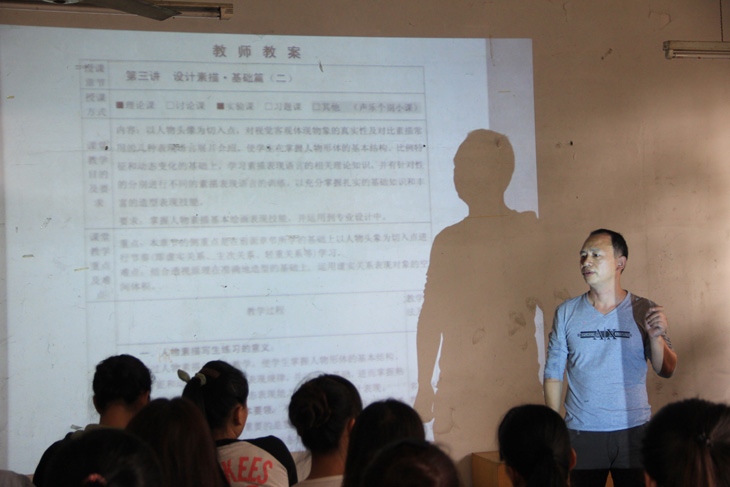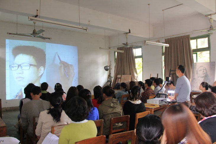 在课堂上,容副教授借助移动投影仪和实物投影仪,进行了人物头像写生的素描教学。课中,容副教授充分展现了他丰富的教学经验和深厚的专业绘画功底。并通过通俗易懂、幽默风趣的口头和肢体语言,充分调动了学生的学习热情,课堂氛围活跃,师生互动频频。