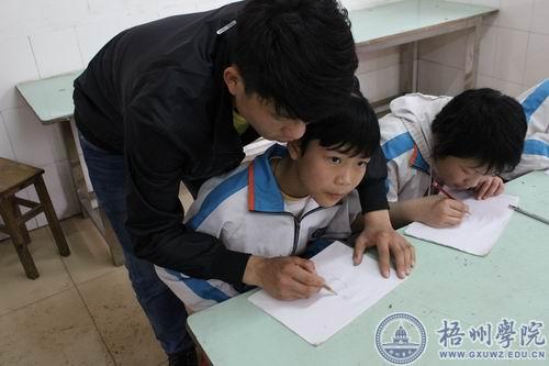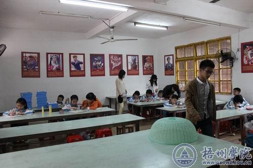 新学期,新动力!3月19日下午,艺术系青年志愿者在梧州市万秀区钱鉴路小学开始了新一轮支教活动。 这是一所梧州市专门设立的农民工子女学校,“没有场地,没有画具,我们就在食堂里作画”。“没有舞蹈室,没有乐器,我们就在简易教室里上课”。志愿者老师们就是在工具匮乏场,地限制这种环境下,给孩子们带来艺术的启迪,让孩子们的兴趣不再埋没。