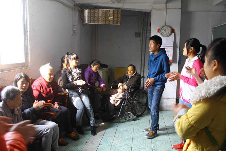 这一天正是24节气中的“大雪”,处于南方的梧州早晨也是寒意不断,但这也无法阻挡两系志愿者的热情。由于人数过多,两系各分小组,每个楼层都有一两个懂得粤语的同学来作为老人与志愿者翻译,男生搬物品,女生拖地擦窗,由于老人行动不便,大家都很小心。温文的言行很快与老人们交流起来,使得工作很快开展并完成。