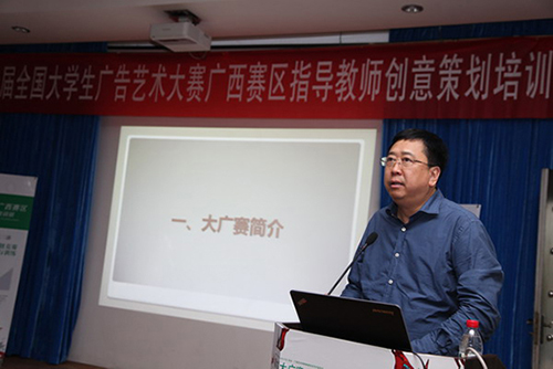 广西艺术学院影视与传媒学院院长汤晓山教授以《创意腾飞 期待成长——全国大学生广告艺术大赛 10年坚守》开启了此次培训班的序幕。作为大广赛的评委,他回顾了全国大学生广告艺术大赛十年来所收获的成果,他总结出 “尽心、引导、参与、评判”八个字作为教师指导学生作品应具备的重要条件,并希望同与会的教师共勉。