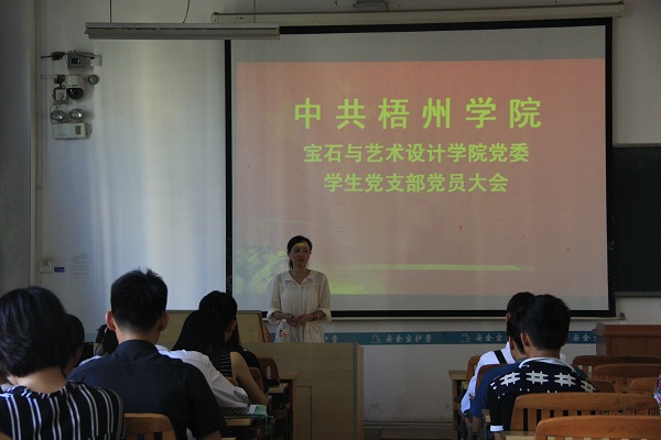 宝石与艺术设计学院学生党支部大会于2015年6月28日召开,暨建党94周年献给党的生日礼物。本次大会由宝石与艺术设计学院党委组织委员韦云霞老师主持。