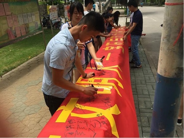 当天中午12点,路过的同学在工作人员的宣传讲解下积极参与到活动当中,并在印有“讲文明话,做文明事,成文明人”字样的大红横幅上签上自己的名字,为自己定下一个承诺。一个个朝气蓬勃的面孔执笔签下名字,从他们一笔一画的书写中,我们不难看到宣传的成果不仅在于校园环境的改变,更是在同学们内心深处对校园文明宣传的支持和认可。一个名字叫做利慧芳的同学在签下自己的名字开玩笑说道:“中华文化博大精深,中国的字也更是与众不同啊,看每个人的签名都很有艺术,很任性的签下自己的大名,这个活动我喜欢”