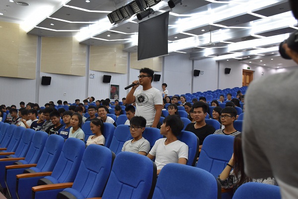 最后,是新生提问环节。各专业同学积极地向三位优秀学生代表提问自己在生活和学习上的问题,三位优秀学生代表一一解答。