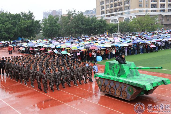 除此之外,机械与材料工程学院、化学工程与资源再利用学院独特的出场方式也让人眼前一亮。以“世界反法西斯胜利暨中国人民抗战胜利70周年”为主题,先是霸气的坦克和整齐的迷彩服队伍入场,在主席台前,部门方块队成员脱掉迷彩服,露出大红色的T恤,定睛一看,原来是摆成了一个数字“70”的阵型,场面恢弘。随后,他们还用学院特色来夺人眼球,用自制的化学仪器和道具作为“枪支弹药”,给同学们展现了抗战年代杀敌拼搏的场景。