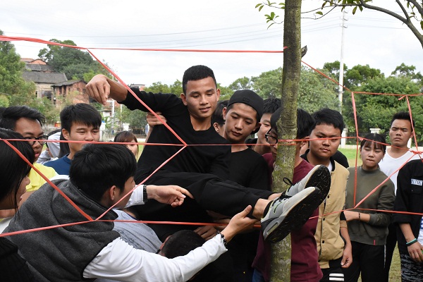 首先一开始的点名传物品游戏调动了整个活动的气氛。其次最为精彩的环节是“穿越火线”,所有人在规定的时间内都必须得穿过火线并且不能碰到电网才算获胜。这个游戏最具有挑战性,它考验大家的智力和团队合作能力。“万里长城永不倒”中,大家分为四个小组,每个小组成员围成一圈后挨个坐在后一个队员的腿上,形成紧密不倒的圈,并喊三遍队名和口号。从中让人看到了我们队长和队员的团结性和互相的信任。