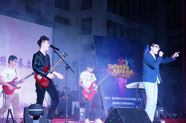 晚会在DRT乐队一首《爱之初体验》拉开了序幕。“如果说你要离开我,请诚实点来告诉我……”开场即高潮,全场掌声不断,大家拍手叫好、欢呼声、尖叫声一阵阵地回荡!伴着《一年更比一年好》的音乐,礼仪队的同学们手持喜庆的红色灯笼走出舞台,可移动式背景板向两侧拉开迎出宝石与艺术学院院长杨杰、师范学院院长邬跃生,文法学院党委书记羊展文三位领导,他们为师生们送上新年祝福。