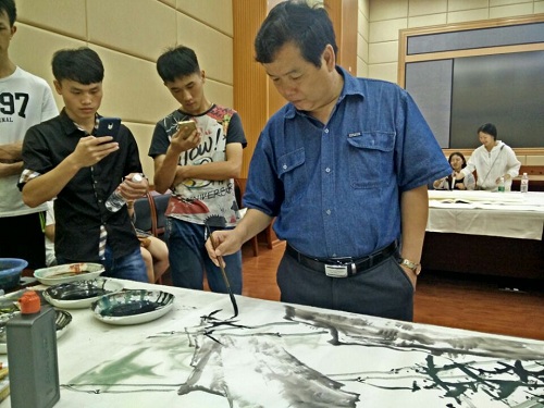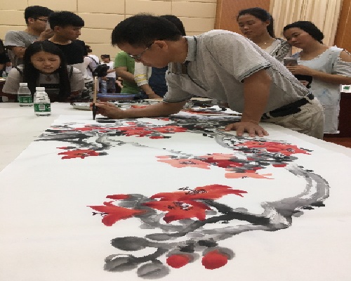 图为:老师现场与同学交流作画
