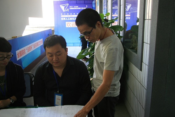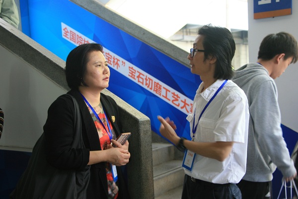 在大赛期间,可以见到每一位工作人员有条不紊的进行工作,忙碌奔波着,宝石与艺术设计学院院长杨杰与负责老师交流、落实工作进展以及与中宝协学术教育专业委员会秘书长张丽葵进行交流、讨论开展下一步工作环节。杨杰院长表示,此次宝石切磨工艺大赛,不仅给广大师生提供了同台竞技、切磋交流的舞台,还积极推动了区域宝石首饰产品设计与加工产业的发展。最后,预祝2017年首届全国院校“法宝杯”切磨工艺大赛取得圆满成功!