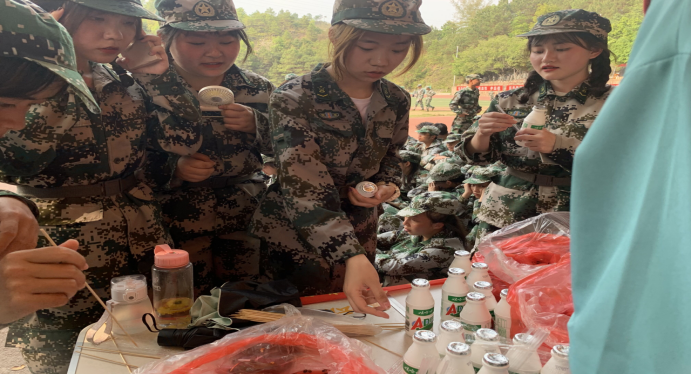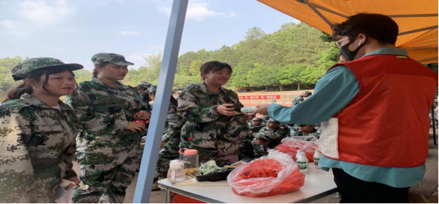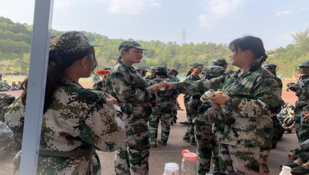 慰问过程,学院党建管理服务中心的学生干部们为军训教官和学生送上饮料和水果,对军训教官的辛苦付出表示感谢,对认真参训的学生表示慰问。