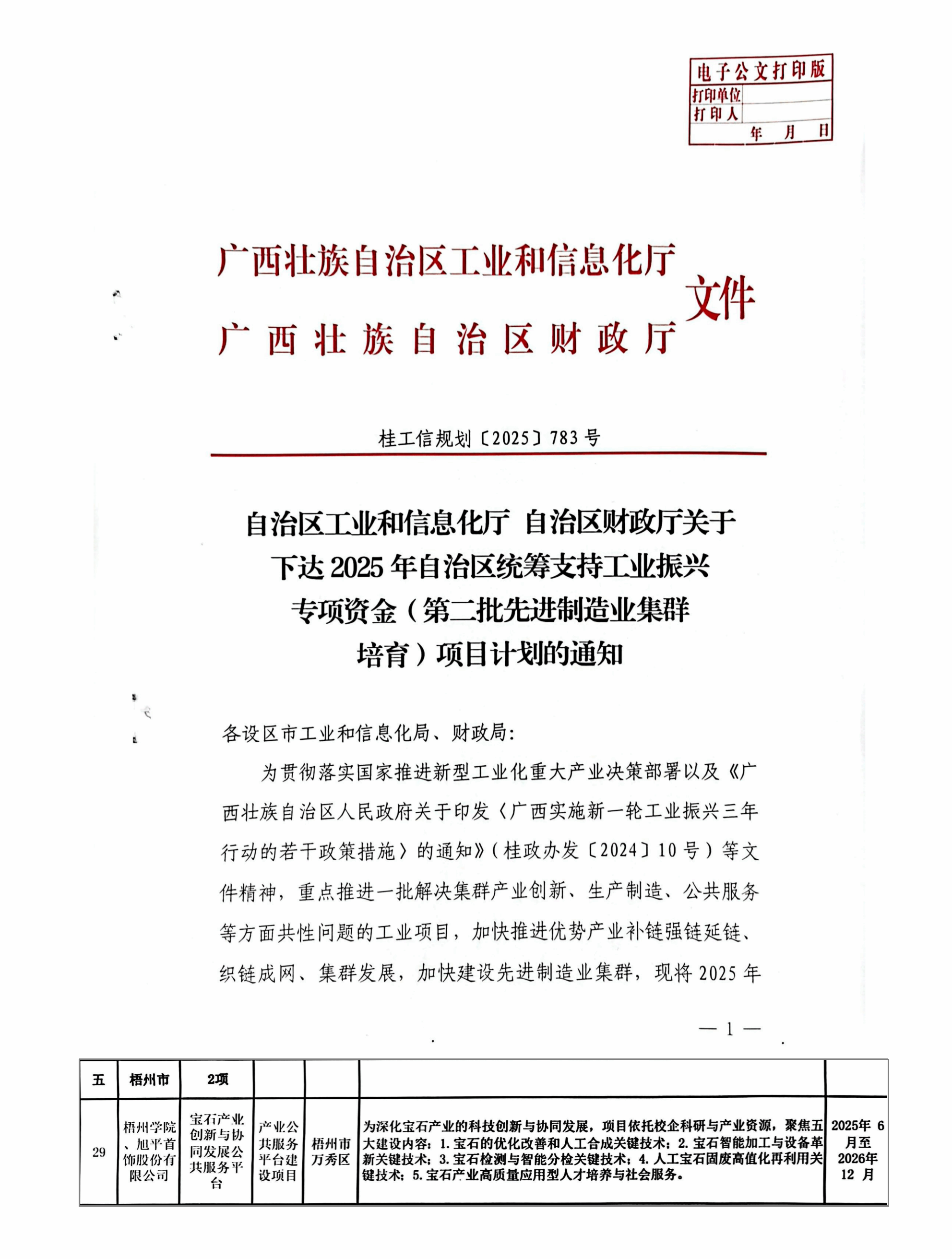 2025年10月,自治区工业和信息化厅、财政厅联合发布《2025年工业振兴专项资金(第二批先进制造业集群培育)计划》的通知,梧州学院与旭平首饰股份有限公司共建的“宝石产业创新与协同发展公共服务平台”成功获批。