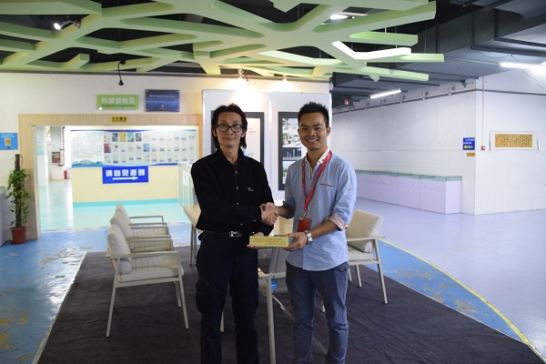 讲座结束后,刘永彰校友为我院捐赠了一套他自己亲自设计并获得国际大奖的沙发作品,他的作品也将在校庆期间进行展示,杨杰院长亲自接收赠送,杨院长对校友们的到来表示热烈欢迎,并和他们讲述了我院发展近况、招生内容以及校庆作品进行了简单的介绍,杨院长感谢校友对母校教学建设的鼎力支持。
