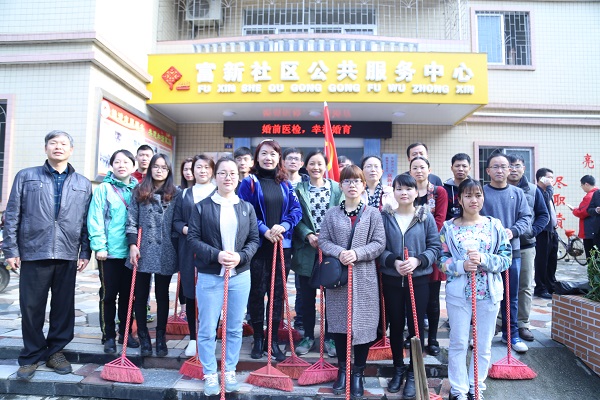 为全面践行党的群众路线,全心全意为群众服务;学习贯彻中央、自治区党委关于推进在职党员进社区开展服务居民活动的部署要求,宝石与艺术设计学院党委组织教工党支部在职党员带头到社区报到,亮明身份、接受监督、参与服务。3月25日上午,教工支部在职党员志愿者钟海明等10位同志及部分学生党员同志,参加了由万秀区富新社区居民委员会组织开展的“党员志愿者服务日活动——义务劳动”活动。