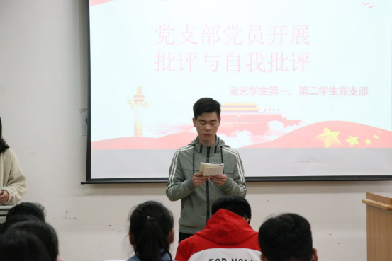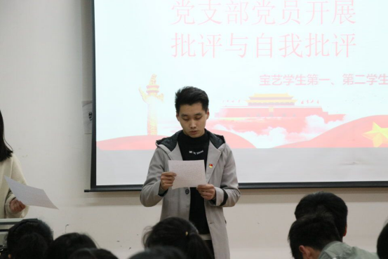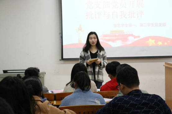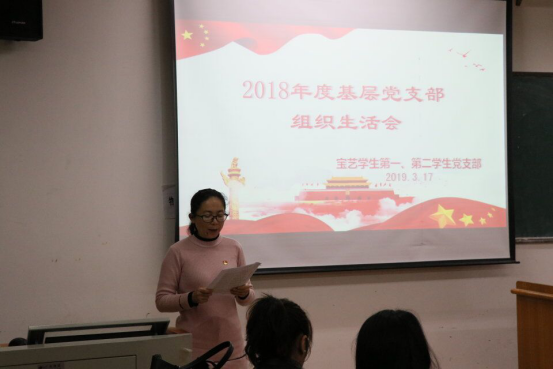 首先,由学生第一支部书记李青同志汇报2018年的学生第一支部工作情况、征求意见情况、并做对照检查;接着是学生第二支部副书记曹穗杏同志对汇报2018年的学生第二支部工作情况、征求意见情况、并做对照检查。随后是发放党支部班子民主评议测评表,对党支部班子进行投票测评。
