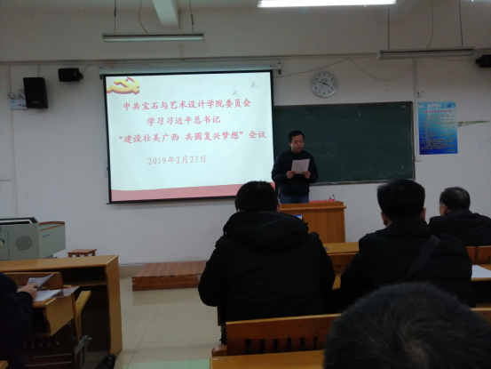 会上,支部书记黄璜老师带领全体党员一起学习了习近平总书记“建设壮美广西 共圆复兴梦想”重要题词精神和《中国共产党支部工作条例(试行》。
