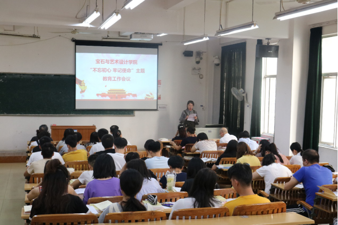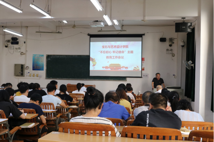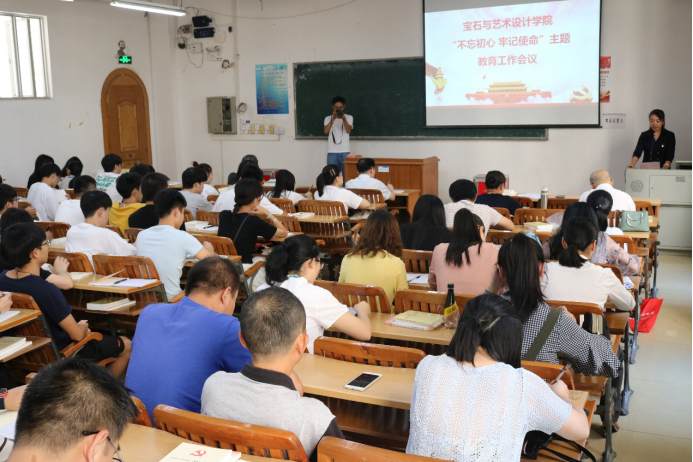 2019年9月25日下午,宝石与艺术设计学院在S205召开“不忘初心、牢记使命”主题教育工作会议。学校纪委书记梁业华、学院党委书记钟海明、学院党委副书记黄石莲、学院院长戴继明、学院副院长贠禄及学院部分师生党员共43人参加了会议,会议由黄石莲副书记主持。