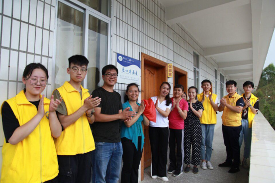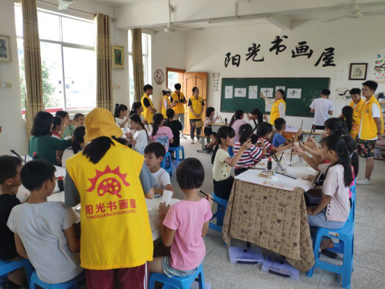 我院党委书记钟海明、副书记黄石莲、团委书记张亚敏,大莫村第一书记谢宜兴,大莫村小学校长覃庆荣与志愿者们正式揭牌。这就意味着“阳光书画屋”正式成立,为大莫村小学未来的美术教育提供一个较好的平台。