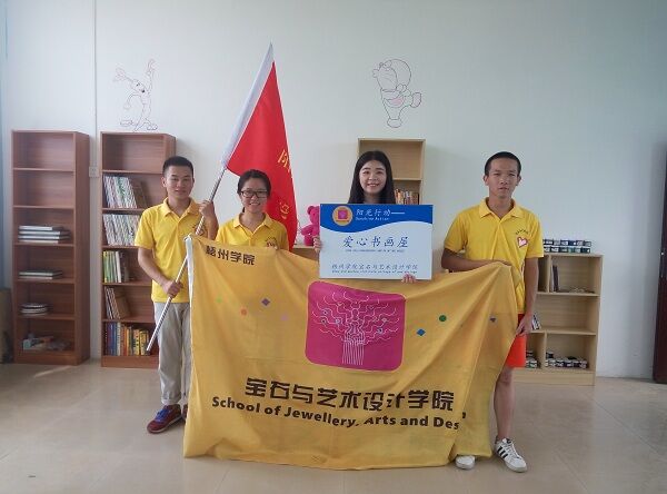 2016年7月17日上午,在梧州市双桥小学举行以“阳光行动—爱心书画屋”为主题的2016年大学生志愿者暑期“三下乡”社会实践活动揭牌仪式。受邀出席揭牌仪式的领导和老师,分别有:学校团委陈远武书记、宝石与艺术设计学院青年工作部长李青老师、双桥小学校长,以及参加活动的青年志愿者们。