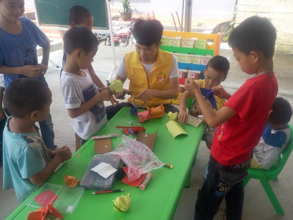 志愿者们抵达目的地便马不停蹄的开始教小朋友们绘画和折纸。开始时小朋友们都很害羞不敢说话,但在志愿者们细心地沟通后,小朋友们终于敞开了心扉,慢慢热情起来并且认真的学习绘画和折纸。