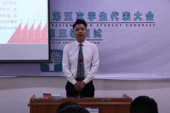 本次换届选举面试主要分为两个环节。首先是三分钟的自由演讲,包括自我介绍、阐述自己竞选的优势和劣势,以及自己对竞选部门的工作设想。本着公平、公正的原则,进行评选产生16名侯选委员,分别是:李宜芸、闫彦仰、郭泽群、陆秀美、陈斌、陈美艳、刘俊辰、潘苑颖、洪璐、陈彬彬、后培壮 、李苗苗、王睿阳、李根、唐晨耀、覃融港。